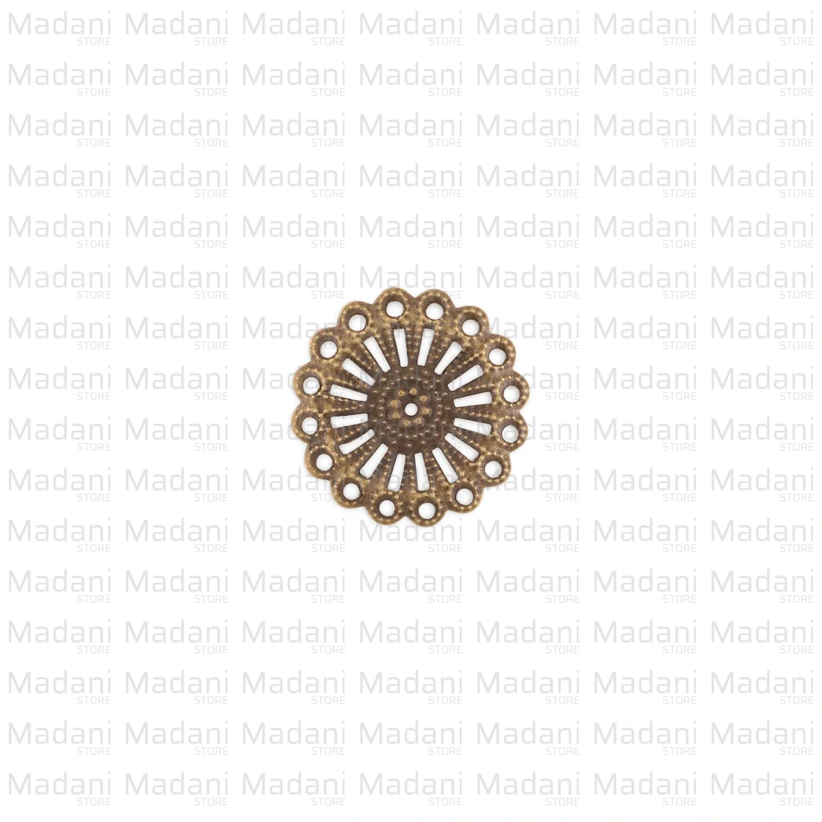 در حاشیهی بیرونی این یراق، ردیفی از حلقههای دایرهای توخالی قرار گرفته که مانند یک زنجیر دور تا دورِ طرح را قاب کردهاند؛ این سوراخهای ریز، فضایی عالی برای آویزان کردن مهره، منگوله یا اتصال به زنجیر در ساخت زیورآلات فراهم میکنند.