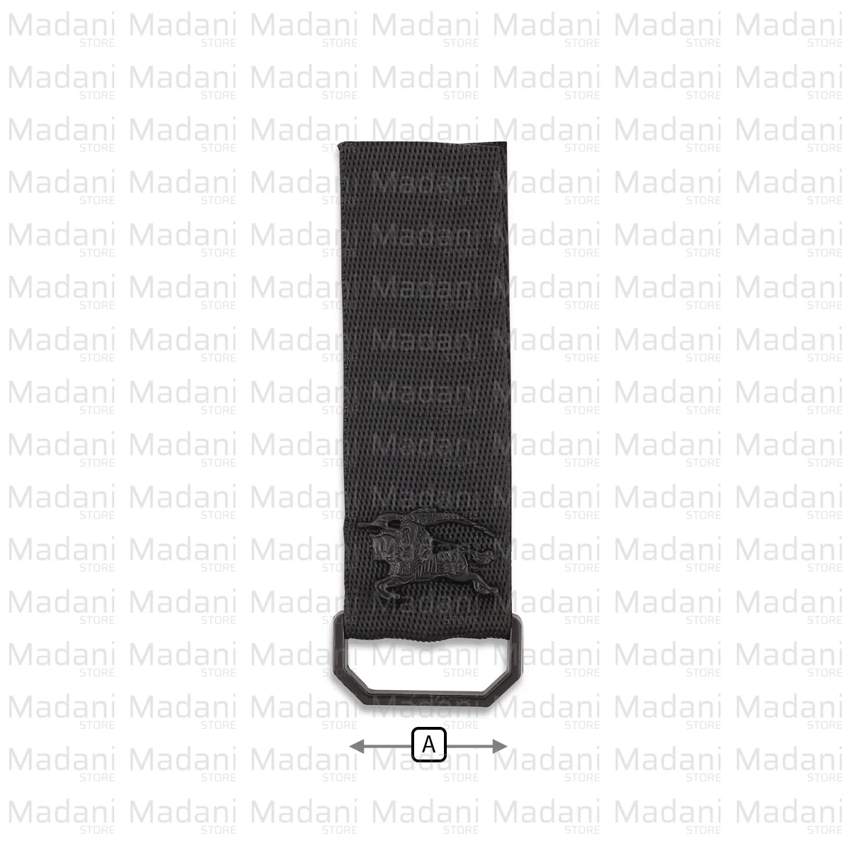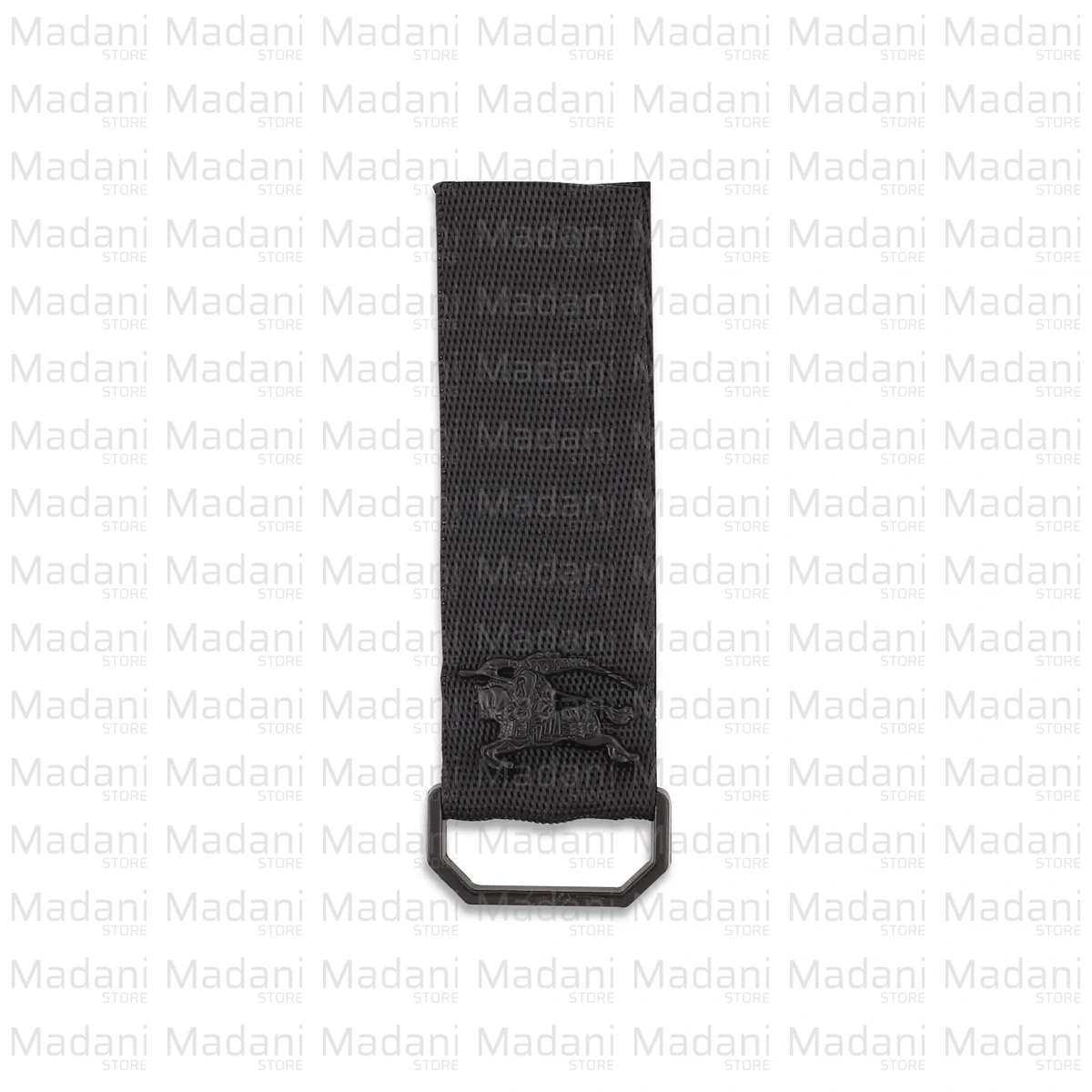 بخش اصلی شامل یک نوار «برزنتی» یا بافتدار محکم به رنگ مشکی است که روی آن نشان فلزی و معروف «شوالیه اسبسوار» برند «بربری» با رنگ دودی/مشکی نصب شده است؛ این استایل «تمام مشکی» ظاهری بسیار مدرن و سنگین دارد.
